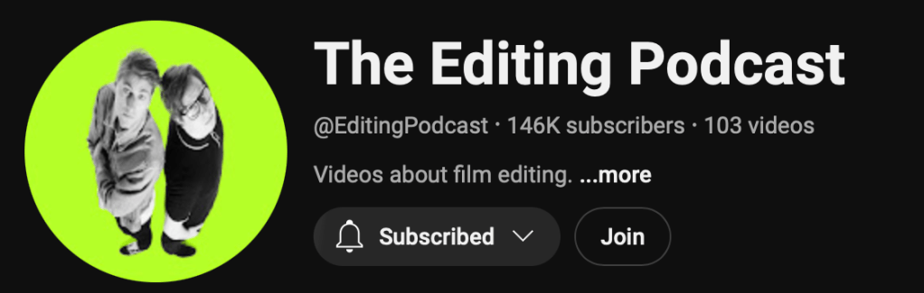 ช่องที่สามพบเจอด้วยความบังเอิญจากการที่ Youtube ส่งมาเข้า Feed ลองกดเข้าไปดูคลิปเดียวเปิดโลกมากครับ เขาจะเวียนพูดคุยกับคนทำงานด้านตัดต่อมากมาย ทั้งแนว MV ทั้งมือรางวัลระดับตัดหนัง Oscar ในการพูดคุยแต่ละครั้ง ได้สอดแทรกความรู้ และนำเสนอให้เข้าใจแบบไม่ยากเย็นเลยครับ ผมเองก็ต้องไปไล่ดูตั้งแต่คลิปก่อนหน้านั้นประมาณ 100 คลิป น่าจะใช้เวลาพอสมควรกว่าจะครบ