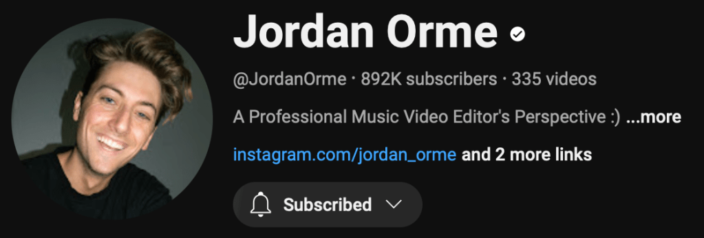 ช่องสุดท้ายที่มาแนะนำในครั้งนี้ก็ได้มาจากที่ได้ดูคุณ Jordan Orme ที่มาเป็นแขกรับเชิญในช่อง Editing Podcast แล้วตามไปยังช่อของเขา คนนี้เก่งด้านการตัด MV ตัดให้กับศิลปินดังๆอย่าง Justin Beiber และอื่นๆอีกมากมาย ในช่องของเขาจะเน้นการ React MV ดังๆ แล้วค่อยๆอธิบายเทคนิคต่างๆที่อยู่ใน MV นั้นๆ น่าสนใจมากๆ เป็นมุมมองจากคนตัดต่อเอง เลยดูได้ไม่เบื่อ ได้รับความรู้กันแบบเต็มๆ
