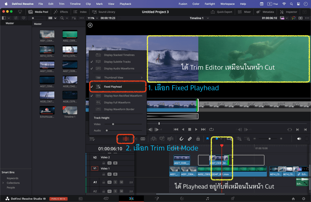 แล้วทุกอย่างก็เปลี่ยนไปกับการอัพเดทในเวอร์ชั่น 19 นี้ สิ่งที่คนตัดต่อด้วย DaVinci Resolve หลายคนอยากให้มีในหน้า Edit คือ Fixed Playhead ที่ทำให้ playhead อยู่นิ่งตรงกลางไทม์ไลน์เหมือนในหน้า Cut เมื่อใช้กับการตัดต่อแบบ Trim Edit Mode และการที่เพิ่ม Trim Editor เข้ามาด้วย ทำให้เราสามารถใช้หน้าจอในการตัดต่อได้อย่างเต็มที่ ตัดได้เหมือนกับในหน้า Cut เลยครับ