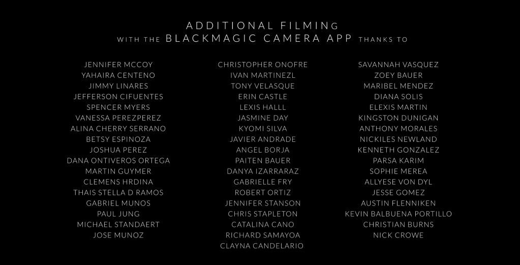 “ในการให้แฟน ๆ ถ่ายวิดีโอด้วยแอป Blackmagic Camera แล้วอัปโหลดเข้าโปรเจกต์ DaVinci ของผม เราแค่ส่งไฟล์พรีเซ็ตให้โหลดลงมือถือ การมีพรีเซ็ตกล้องช่วยให้ทุกคนถ่ายด้วยฟอร์แมตและการตั้งค่าอัปโหลดแบบเดียวกัน ส่วนการซิงค์ Timecode ก็แค่ใช้เวลาปัจจุบันของแต่ละเครื่อง! ถ้ามีเวลาอีกหน่อย ผมน่าจะใช้ QR code แทนไฟล์พรีเซ็ตได้เลย ซึ่งจะช่วยประหยัดเวลาไปมาก”