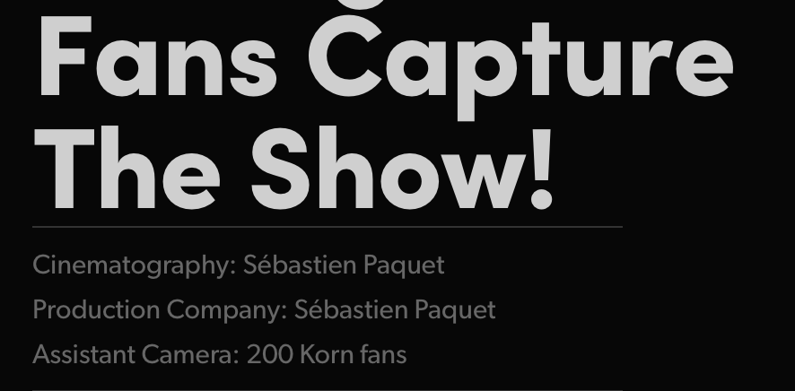 “คืนวันคอนเสิร์ตเป็นครั้งแรกที่เคยมีอะไรแบบนี้เกิดขึ้น! ผมไม่รู้จักศิลปินคนไหนที่ให้แฟน ๆ กว่า 200 คน ถ่ายวงจากมุมมองของตัวเองด้วยอุปกรณ์ของตัวเอง แล้วสามารถแชร์ฟุตเทจเหล่านั้นมาใช้ในวิดีโอสรุปอย่างเป็นทางการได้ — และเท่ห์แบบสุดจัดๆ ก็มีชื่ออยู่ในช่วง End Credits ด้วย ในฐานะ Assistant Camera: 200 Korn fans
